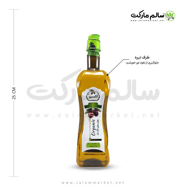 روغن زیتون نیم لیتری اکسیر، محصول دیگری از شرکت روغن زیتون اکسیر جلالت است. روغن زیتون فرابکر نیم لیتری در بسته بندی پت تیره رنگ (برای جلوگیری از نفوذ نور و ماندگاری بالا) و با نشان سیب سلامت [شماره پروانه: 16/23824] تولید و عرضه می شود. این روغن ارگانیک، تا 18 ماه پس از تولید قابل استفاده بوده و برای سالاد، پخت و پز و سرخ کردن با حرارت ملایم مناسب است. این محصول برای کسانی مناسب است که قصد خرید روغن زیتون اکسیر در حجم کم را دارند.