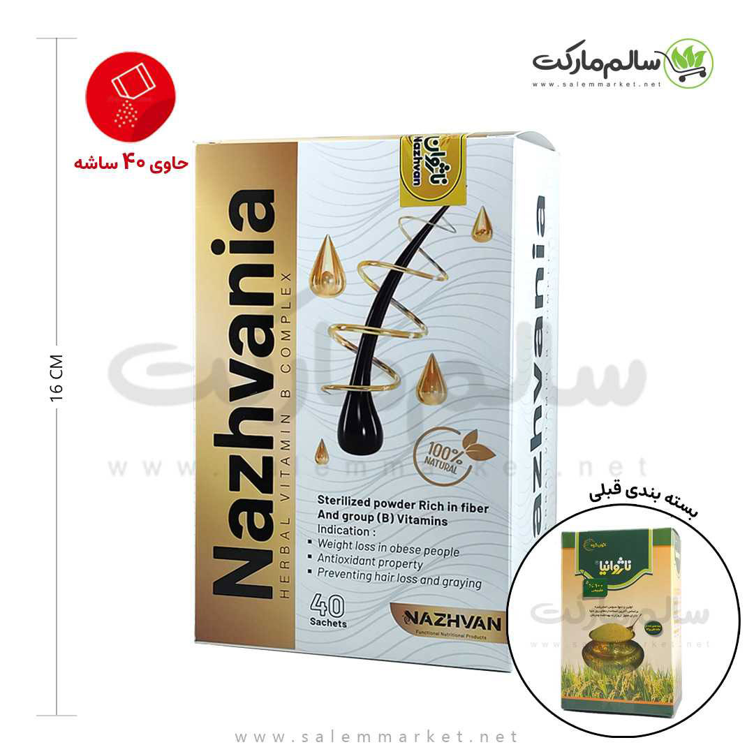 پودر ناژوانیا، پودر سبوس برنج قهوه ای، در بسته بندی ساشه ای 40 عددی برای مصرف روزانه است. این محصول با ماندگاری سه ساله، دارای نشان سیب سلامت از سازمان غذا و دارو است. علاوه بر خواص بی نظیر سبوس برنج برای مو، این محصول خاصیت ضد پیری داشته و باعث جلوگیری از ریزش و سفید شدن مو ها می شود. حفظ رطوبت پوست و پیشگیری از چین و چروک از دیگر خواص این محصول پر فایده است.